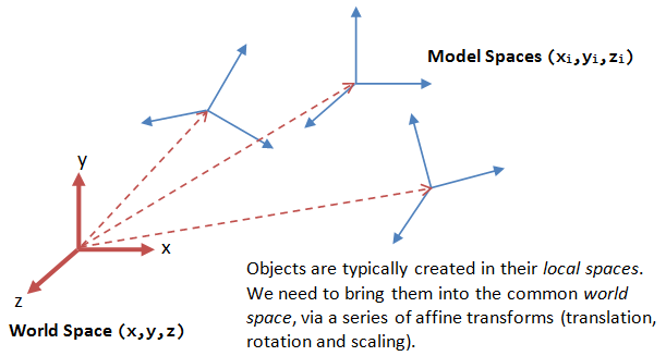 Those X, Y, and Z values for each vertex exist in a geometry’s local (or model) space, where each vertex’s coordinates are kept in relation to each other. Scenes are the next step up, containing a collection of individual geometries in relation to each other. Scenes have a world space, with their origins located at 0, 0, 0 on the XYZ axes. Geometries that exist in a scene are given a rotation, translation, and scale value to dictate how they are positioned in the world space. So together we have our geometry existing in both a local space and a world (scene) space.