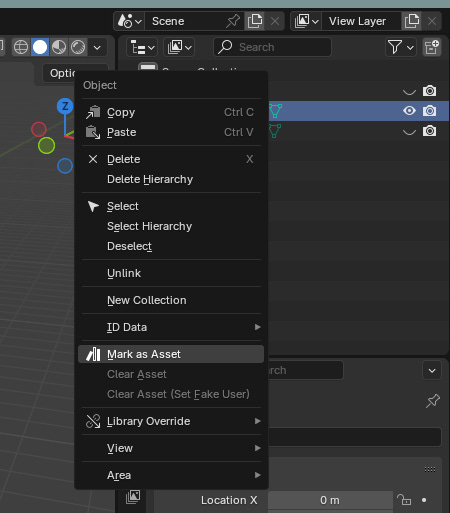 I want to create a whole Asset Library with this flatbed train car as it’s first component. Let’s not get ahead of ourselves though, first we need to make sure that Blender knows we want the flatbed car to be an Asset. What we do is simply right-click the object in the Outliner window and select “Mark as Asset”.